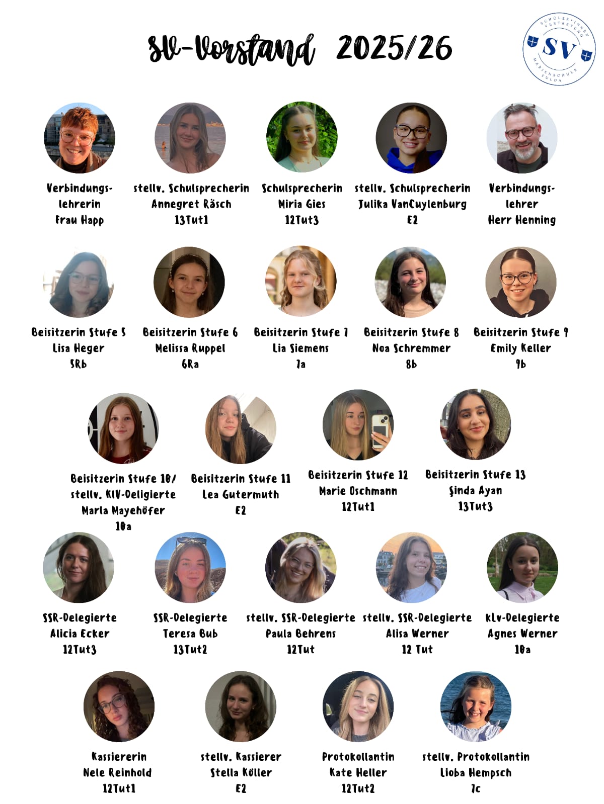 Das SV-Team setzt sich aus gewählten Schülerinnen zusammen und trifft sich wöchentlich. In der ersten Schülerratssitzung (SR-Sitzung) des Schuljahres werden die SV–Mitglieder gewählt. Darunter zählen die Schulsprecherin und ihre 2 Stellvertreterinnen, 2 Stadtschülerratsdeligierte (SSR–Deligierte) und ihre 2 Stellvertreterinnen, die 9 Stufensprecherinnen sowie je eine Kassenwartin und Schriftführerin mit jeweils einer Stellvertreterin.