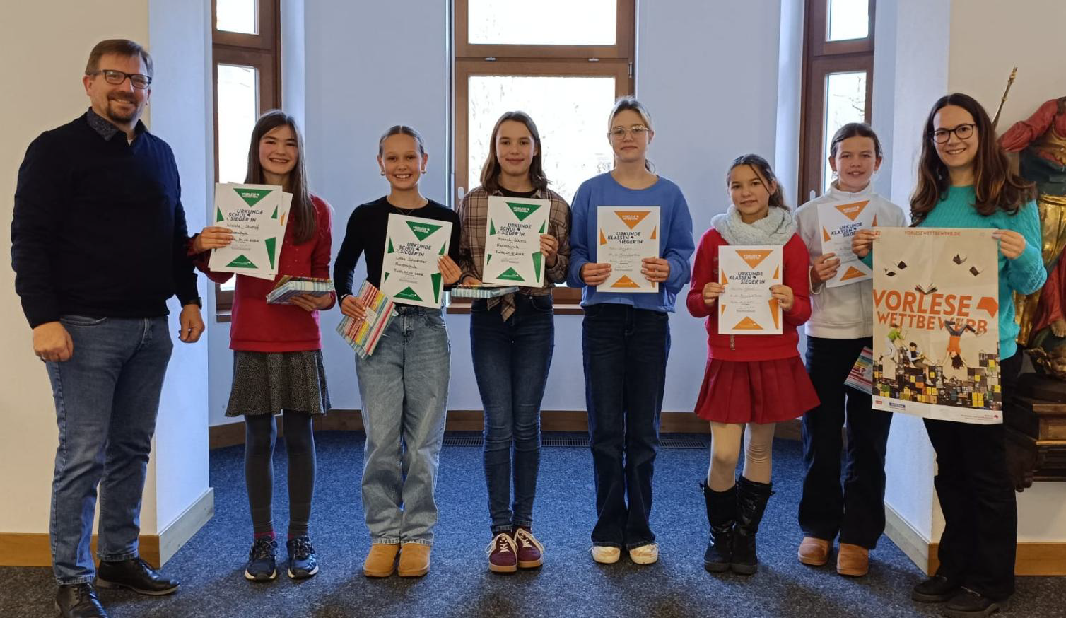 In der Vorweihnachtszeit lädt die Stiftung Lesen Jahr für Jahr alle 6. Klassen in Deutschland zum Vorlesewettbewerb ein. Am letzten Donnerstag war es an der Marienschule wieder soweit. Die Klassensiegerinnen aus Gymnasium und Realschule traten in der Mediathek zum Schulentscheid an. Sie hatten sich zusammen mit den diesjährigen Deutschlehrkräften der Jahrgangsstufe 6 gründlich auf das Schulfinale vorbereitet.